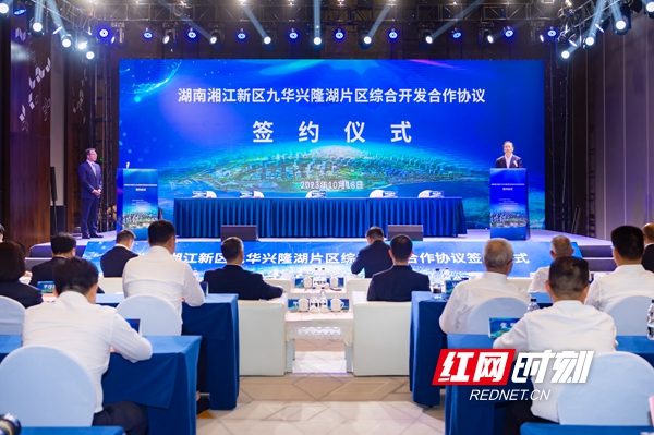 《九华兴隆湖片区综合开发合作协议》签约仪式在湖南湘江新区举行,标志着兴隆湖片区合作开发进入新的历史阶段。湘潭市委书记刘志仁,湘潭市委副书记、市长胡贺波,长沙市委副书记、湖南湘江新区(长沙高新区)党工委书记、岳麓区委书记谭勇,湖南湘江新区(长沙高新区)管委会主任、岳麓区区长何朝晖,湘潭市领导刘新华、董巍,新区领导罗社辉、杨中建等出席。