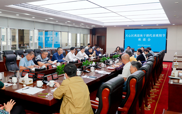 天心区委书记吴新伟主持召开离退休干部代表座谈会,通报全区经济社会发展情况和特色亮点,听取老领导、老同志的意见建议,并致以重阳佳节的祝福。区委副书记、区长周志军通报今年以来天心经济社会发展情况。区委副书记、统战部长厉波,区人大常委会党组书记、主任黄文先,区政协党组书记、主席张界贻,区领导许波、张建,以及老同志李子玲、曹健、于献、夏艳兰等出席。