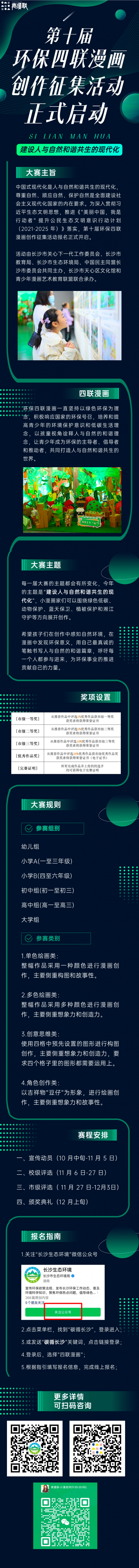 为深入贯彻习近平生态文明思想,宣传普及“尊重自然、顺应自然、保护自然”的环保理念,倡导青少年用画笔勾勒环保的美好蓝图,11月6日,第十届环保四联漫画创作征集活动正式启动。活动由长沙市关心下一代工作委员会、长沙市教育局、长沙市生态环境局、中国民主同盟长沙市委员会共同主办,长沙市天心区文化馆和青少年漫画艺术教育联盟联合承办。