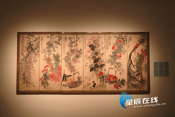 展览中,与吴昌硕的作品隔墙呼应的是齐白石的一套大幅《花鸟六条屏》。在艺术风貌上,无论是绘画题材,还是水墨的运用及构图,两位大师都截然不同,但俱臻妙境。而从展厅内的两套作品对比来看,吴昌硕在色彩表达上更有厚重感,多以层层渲染为主,齐白石则用色简单明快,注重近似色和互补色的关系,借鉴了民俗绘画的墨色运用,给人一种雅俗共赏的感觉。