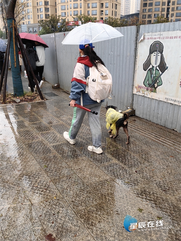 (手牵着小狗的毅行者与刘雅诗擦肩而过,看到这一幕,她心里暖暖的。)