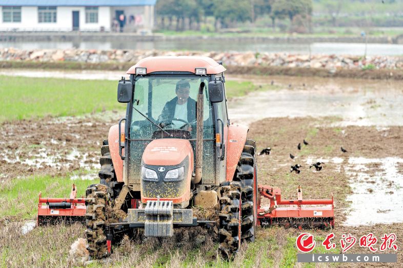 90后种粮大户姚鹏飞驾着农机在田里劳作,田间陪伴他的是成群小鸟。 长沙晚报全媒体记者 陈飞 摄(资料图片)