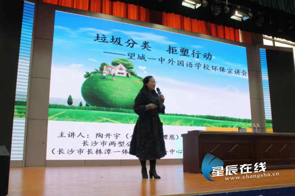 (陶开宇在望城一中外国语学校进行“垃圾分类,拒塑行动”主题宣讲。)