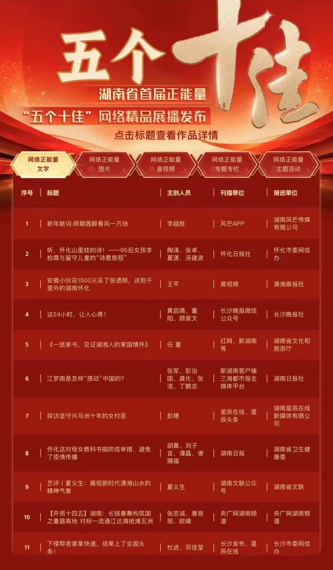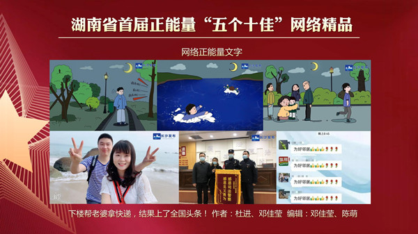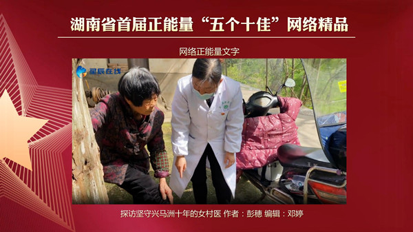 现场发布了2022年“网络正能量文字”“网络正能量图片”“网络正能量音视频”“网络正能量专题专栏”“网络正能量主题活动”五大类共52件网络精品,星辰在线3件作品上榜,分别为网络正能量文字作品《探访坚守兴马洲十年的女村医》《下楼帮老婆拿快递,结果上了全国头条》,网络正能量主题活动《“爱长沙每一度”网络创意传播活动》。