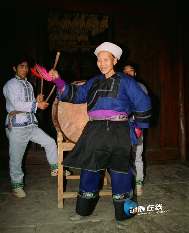古丈苗族四方鼓表演,舞者狂奔击鼓。
