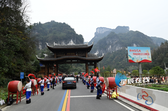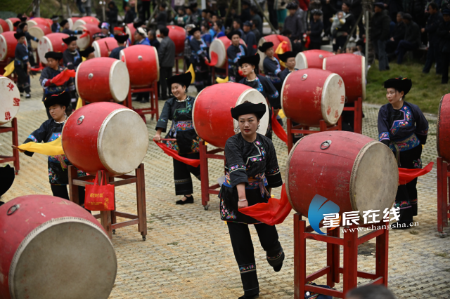2023年11月25日,湘西州苗族鼓舞培训班结业典礼暨展演在吉首市矮寨镇坪年村举行,吉首、花垣、凤凰、古丈、保靖等地苗鼓学员、老师及附近村寨的非遗队伍参加,乾州女子苗鼓队在村口打迎宾花鼓迎接宾客。