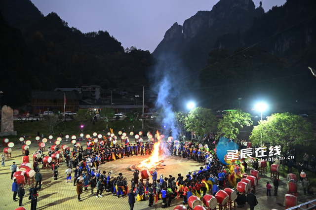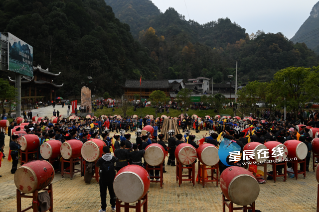 随着主导鼓手敲打的节拍,老少跳起苗族调年舞,调年舞是吉首丹青、泸溪梁家潭、古丈坪坝一带苗族传承下来原生态舞蹈,一般在正月十五举行,参与者围成圆圈,双手自然摆动,做耕地、插秧、搓麻等生产动作,以欢快起舞庆贺新年,祈求来年风调雨顺,五谷丰登。