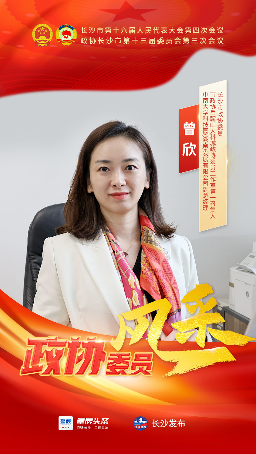 曾欣,长沙市政协委员、市政协岳麓山大科城政协委员工作室第一召集人、中南大学科技园(湖南)发展有限公司副总经理