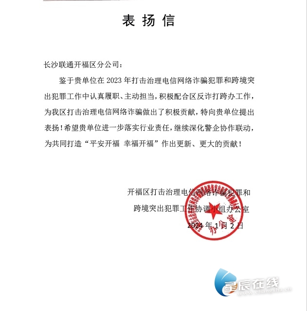 星辰在线1月9日讯 (通讯员 肖哲芝)1月5日,长沙联通开福区分公司收到了一封来自开福区打击治理电信网络诈骗犯罪和跨境突出犯罪工作协调小组办公室的表扬信,信中提到:“长沙联通开福区分公司在2023年打击治理电信网络诈骗犯罪和跨境突出犯罪工作中认真履职、主动担当,积极配合区反诈打垮办工作,为开福区打击治理电信网络诈骗做出了积极贡献,特向长沙联通提出表扬”。