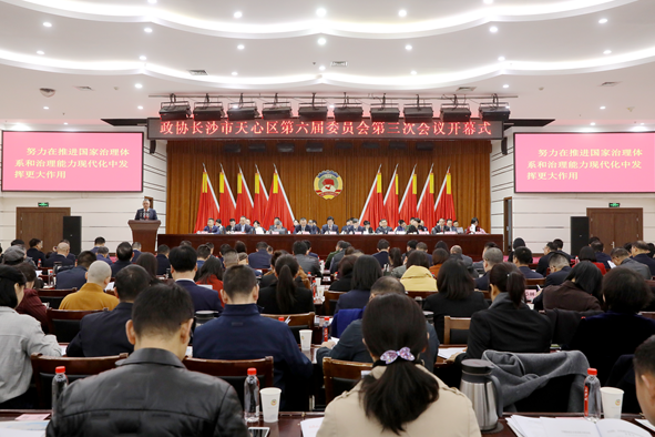 中国人民政治协商会议长沙市天心区第六届委员会第三次会议在区机关三楼大会场隆重开幕。来自全区各党派、各界别、各条战线的政协委员齐聚一堂,共襄盛会。他们将以饱满的热情与高度的政治责任心,忠实履行政治协商、民主监督、参政议政职能,共同为全面建设社会主义现代化新天心而团结奋斗。全体政协委员,天心区委书记吴新伟,天心区委副书记、区长周志军,区委副书记、统战部长厉波,区人大常委会党组书记、主任黄文先,区政协党组书记、主席张界贻,园区领导曾红鹰、刘向,历届区委、区人大、区政府、区政协正职领导,全区副县级以上领导干部,区公检法主要负责人,双重领导及垂直管理单位主要负责人,区委常委部门常务副职,区直机关各部门党政主要负责人,各街道党政主要负责人,老委员咨询团成员,相关党派负责人出席会议。会议由区政协党组副书记、副主席黄会主持,区政协副主席赵英华致开幕词。
