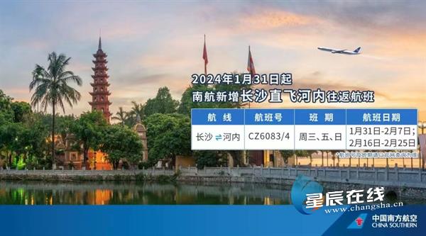 (1月31日起,长沙↔河内的航线每周三、五、七执行,当日往返。)