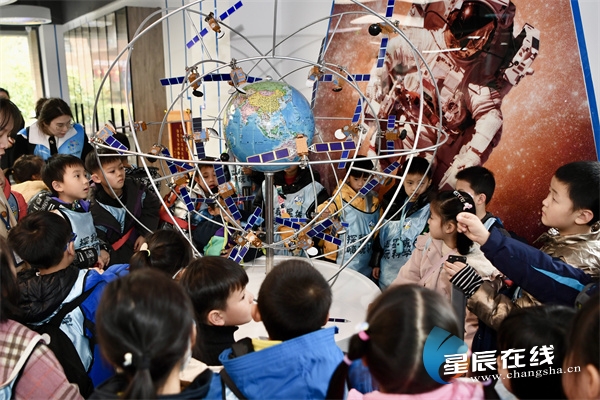 (孩子们对北斗卫星等比例模型充满好奇。)