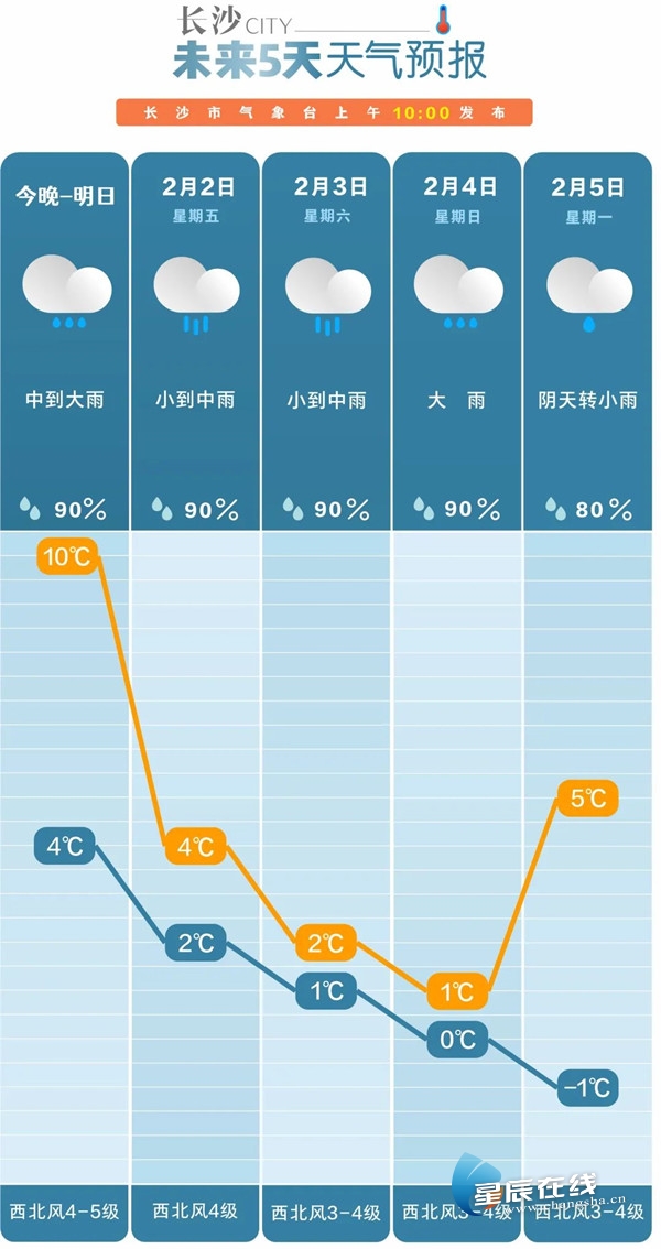 据长沙气象局预报,1日夜间到4日白天,冷空气南下,阴雨维持,西部有冻雨,气温下降8到10℃,北风加大至5级;5到6日阴雨持续;7日小雨转雨夹雪。