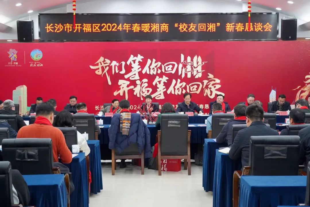 长沙市开福区2024年春暖湘商“校友回湘”新春恳谈会召开,来自智能制造、三航、信创、生物医药、高端服务等各领域的杰出校友、湘商齐聚一堂,共叙友谊、共谋发展。开福区委书记罗玉环出席,开福区委副书记、区长高伟主持活动。