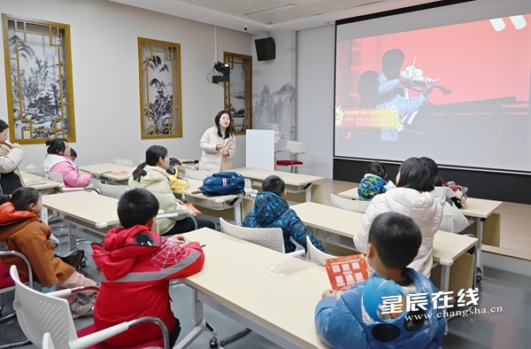 在长沙市图书馆一楼,专业演奏人员正为市民们演奏轻快的乐曲,优美的旋律徜徉在琴键、琴弦上。家长和孩子们在演奏区静静聆听,有的市民还时不时拿出手机录像。在演奏区旁,LED屏中的音乐情景剧视频《赓续》也吸引了不少市民驻足。星辰全媒体记者在现场看到,一楼还专门设置了猜灯谜区,不少家庭正聚在一起猜灯谜,猜出谜底的家庭可以凭借灯谜答案兑换与家风有关的书籍,书籍参考市图书馆提供的家风书单。此外,市民朋友还可以加入#长沙市好家风音乐故事会微博、抖音话题讨论,单条点击阅读量排前30的网友可获得社会实践证书。
