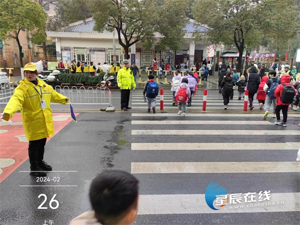 星辰在线2月26日讯(星辰全媒体记者 周子豪)“一年又一年,看到孩子们进出学校,仿佛自己也变年轻了,守护着孩子们的成长,是一件很有意义的事情。”2月26日,长沙市开福交警大队民警宋学文一早就在湖南一师大附二小学门口开始了执勤。今天是长沙市中小学、幼儿园2024年春季开学的日子,宋学文一如既往地开始了“护学”工作。