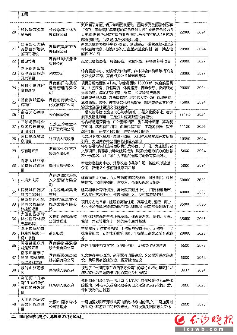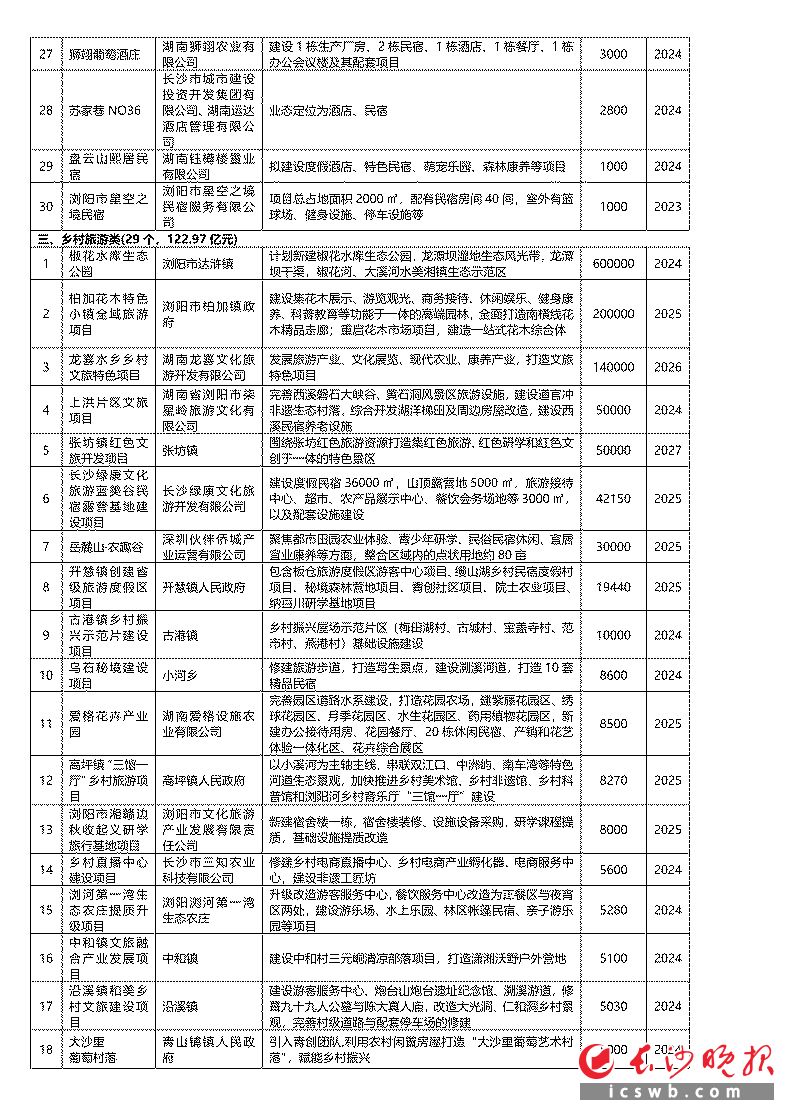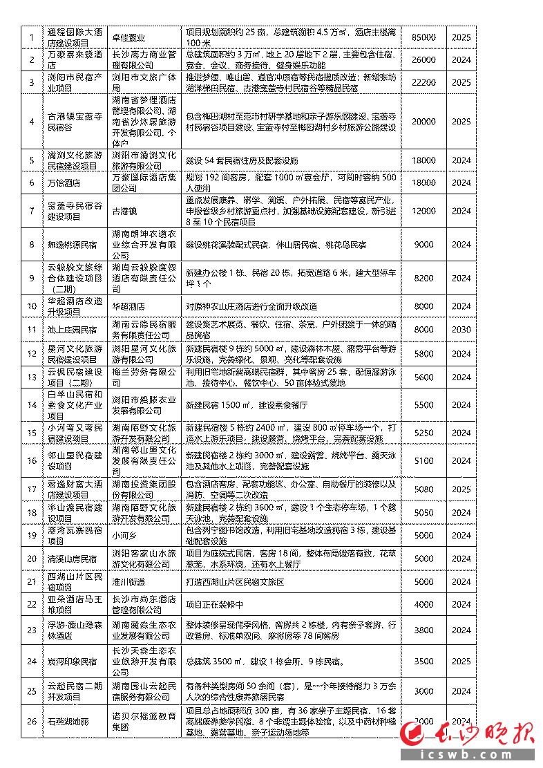 酒店民宿类方面,浏阳市民宿产业项目将投资2.2亿元,推进梦俚、唯山居、道官冲原宿等民宿提质改造,新增张坊湖洋梯田民宿、古港宝盖寺村民宿谷等精品民宿。