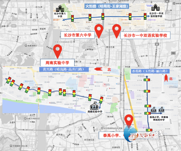 通过分析学校周边主要接送车流方向,长沙交警贴心设置了送学绿波,方便学生家长接送上下学。在不影响整体路网交通情况下,目前已打造黄兴路(晴岚路-高升门路)、火炬路(明苑街-王家湖路)、香莲路(玉竹路-丽白路)3条上学线路“绿波带”,满足家长接送学生通行需求,保障市民正常通行。