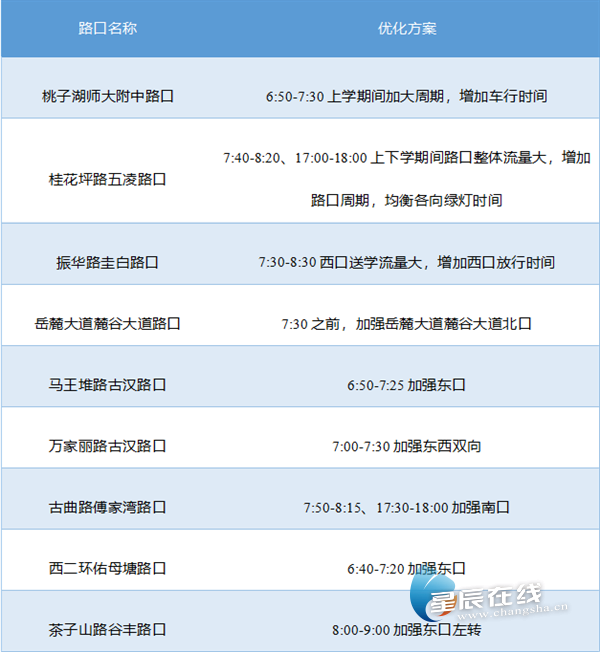 根据开学后的交通情况,长沙交警还对交通信号进行了优化。通过对全市学校周边的交通信号配时进行全面排查,交警部门调整优化了信号配时和时段划分,取消学校周边路段人行横道信号灯上下学时段的黄闪,全部改为“红、黄、绿”模式,减少人车冲突。