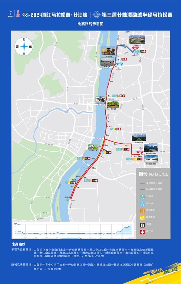 本届马拉松赛从长沙贺龙体育中心出发,途径劳动路、湘江路、湘府路,四羊方尊广场、火车头文化公园、天心湘江黄金岸线等串联其中,让五湖四海的选手在奔跑中感受山水洲城、网红天心的独特魅力,展示天心区最美湘江岸线与长株潭整体规划中关键节点——省府新区所辖的独特城市发展风貌。