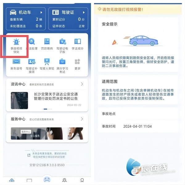 (发生事故后当事人可现场通过“交管12123”APP进行视频报警,系统自动定位事故地点信息。)