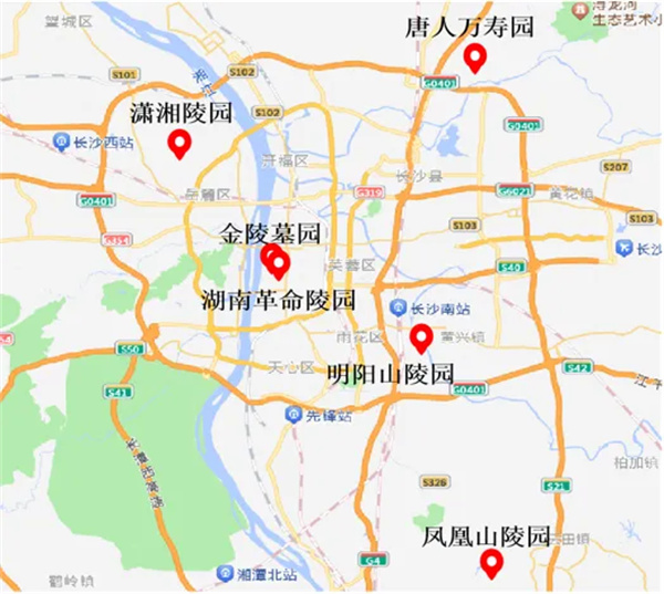 (长沙市陵园墓地周边地图。)