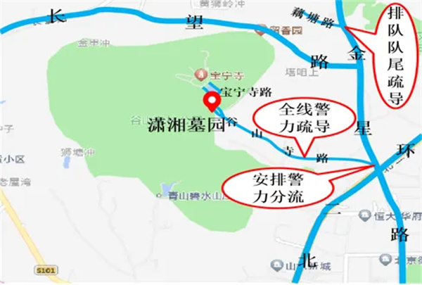 交通拥堵预警:潇湘陵园周边停车场承载量相对有限,谷山寺路双向仅两车道,通行条件不好,且地铁、公交等公共交通站点覆盖率低,易造成拥堵。祭扫车辆主要通行路段为金星路、宝宁寺路、潇湘陵园内部道路,易拥堵点为谷山寺路、潇湘陵园内部道路。