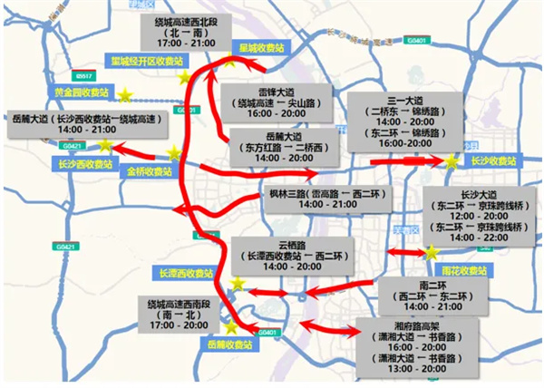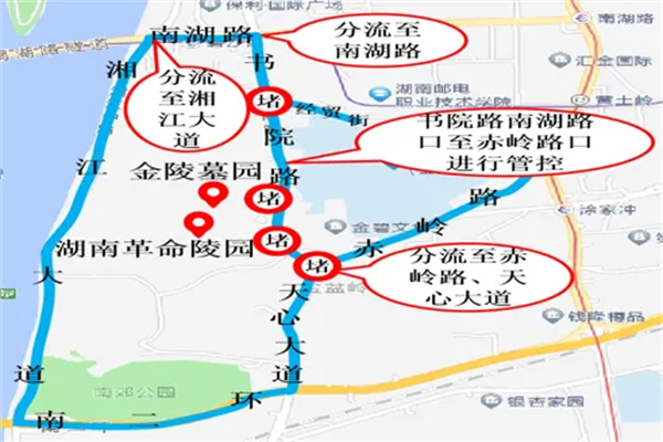 管控措施:长沙交警将对书院路南湖路口至赤岭路口进行管控,分流线路为南湖路、湘江路、赤岭路、天心大道,值守警力加强管控路口分流方向交通疏导。