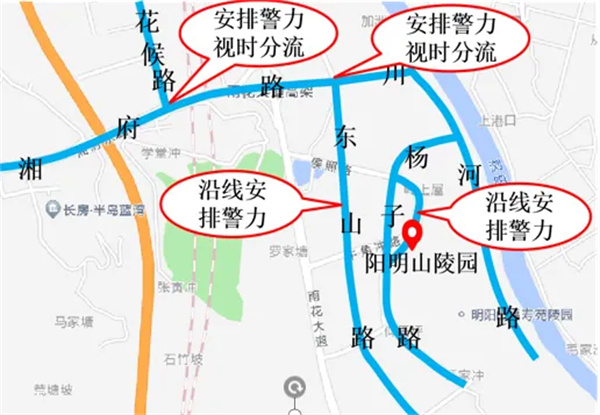 交通拥堵预警:明阳山陵园祭扫车辆主要通行路段为湘府路、东山路、扬子路;易拥堵点为陵园门口、殡仪馆处。