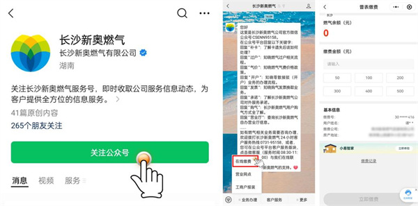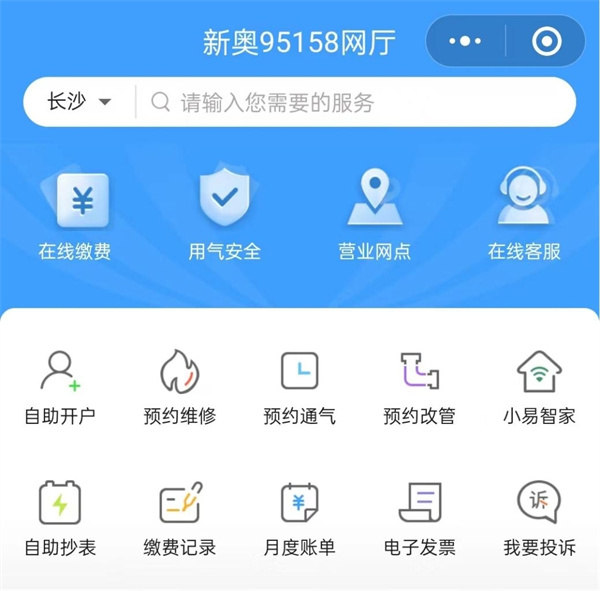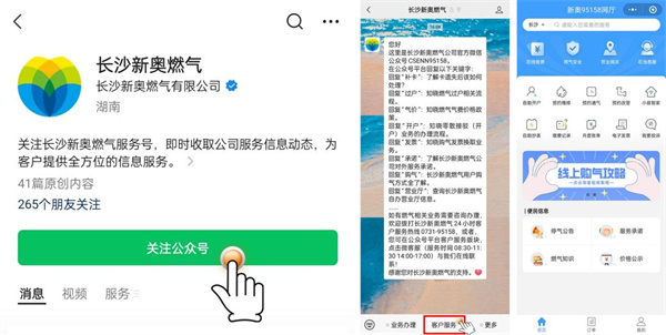 关注长沙新奥燃气微信公众号,点击底部菜单“客户服务”直达95158网厅首页,即可便捷办理燃气业务。