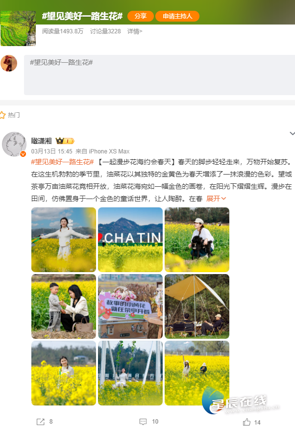 “周末来小住两天,不虚此行。”作为茶亭花海的忠实粉丝,线上网友李女士已经连续数年呼朋唤友来赏花,她细说道:“塔树共生景点提质后更美了,特色餐饮店和民宿增多了,还有露营、爬山、音乐会等活动都很有意思。”除此之外,不少网友纷纷留言表示想来茶亭花海体验打卡拍照、春日乡村田园生活;也有网友感叹大V的摄影技术,把长沙茶园拍成了壁纸,令人向往。话题热度不断升温,微博话题阅读量达3000万+。