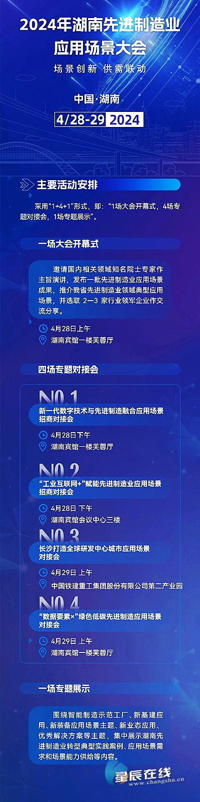 4场专题对接会分别为新一代数字技术与先进制造融合应用场景对接会、“工业互联网+”赋能先进制造业应用场景对接会、长沙打造全球研发中心城市应用场景对接会和“数据要素×”绿色低碳先进制造应用场景对接会,聚焦设备更新和消费品以旧换新,开展供需对接,推动招商引资、集聚产业资源、促进产业升级。