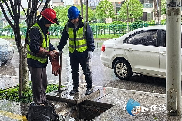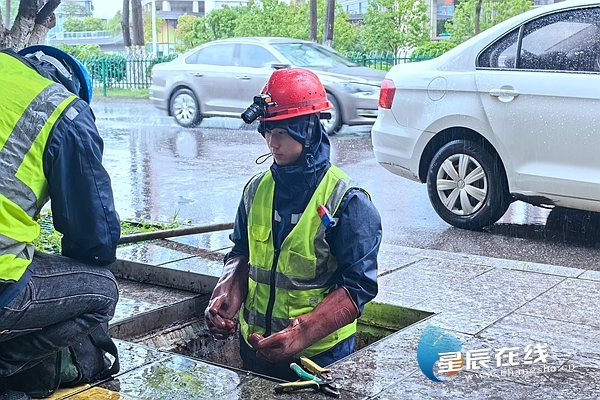 (暴雨天安排队伍对低洼地段进行特巡,排除安全隐患。以上图片均由 星辰全媒体记者 田也 摄)