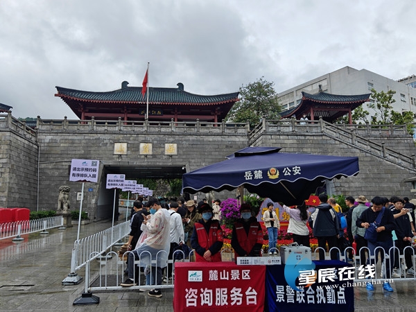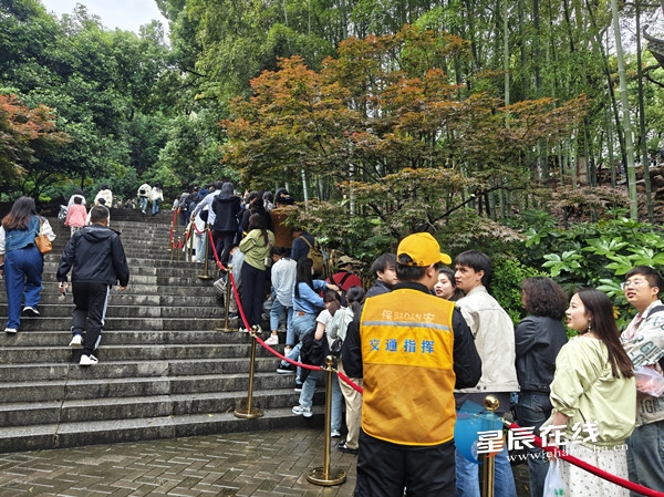 (游人如织,麓山景区工作人员正有序引导大家文明前行。)