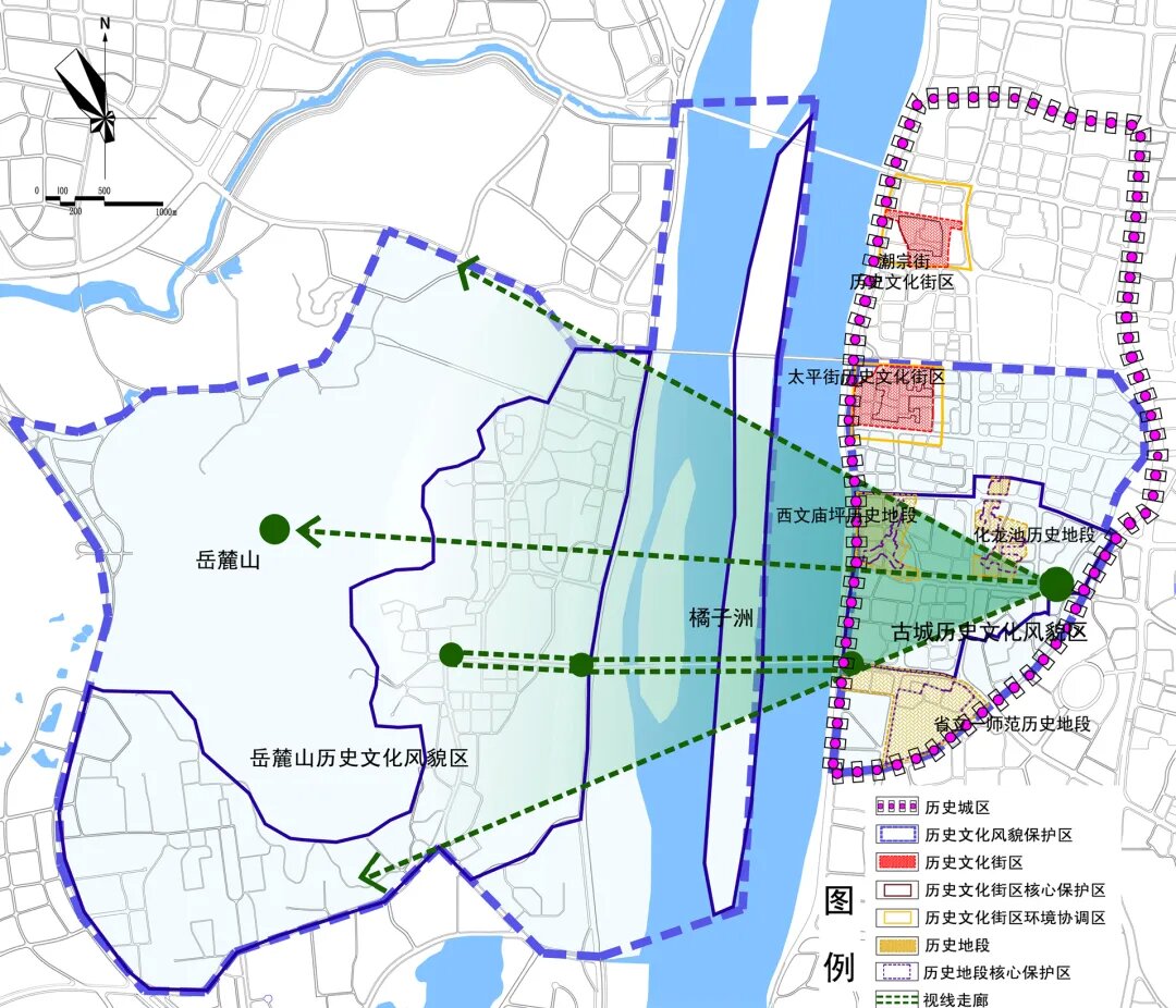 (天心阁至岳麓山视廊。《长沙市历史文化名城保护规划》)