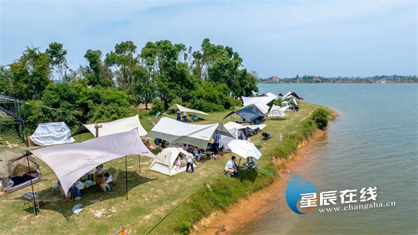 据介绍,望城区靖港镇历史悠久,风光秀丽,拥有靖港古镇、千龙湖两个4A级景区和千龙湖国家湿地公园。近年来,靖港镇立足丰富的文化古迹和秀美的自然景观,打造团头湖西围子美丽宜居村庄示范片,打造团头湖畔绝佳露营地,让游客在踏青露营的同时体验原生态的鲜美和美丽乡村的魅力。示范片总面积约10.04平方公里,核心区1.78平方公里,涉及300户农户,以“绿色生态”为主要建设理念,设计就地取材,废物利用,只在服务游客功能上做加法,在停车、公共卫生设备、露营设备和服务上进行升级;建设材料多为原木,建设过程中保持了原有生态林木,特别是西围子上保持原封不动,保持自然野趣。西围子露营基地热度不断,被大众点评评为“长沙十大网红露营打卡点”,素有“天空之境”的美称。