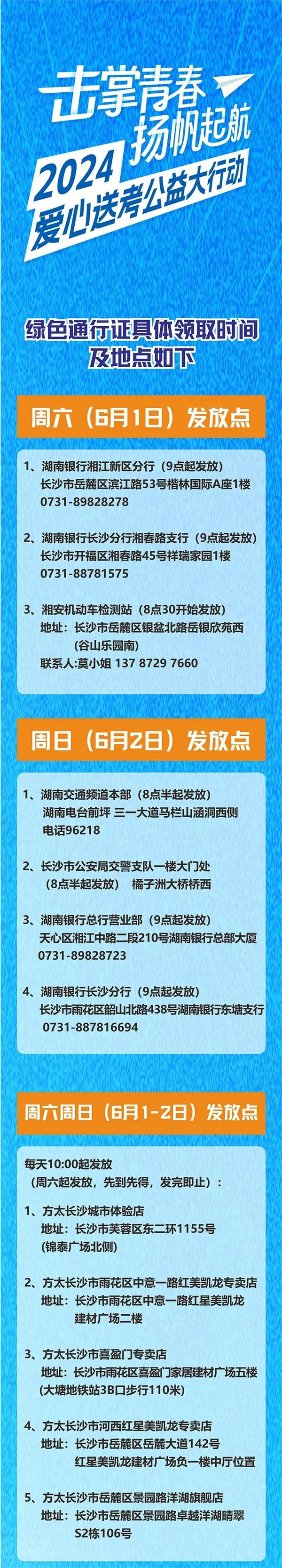 考生家长只需关注长沙交警微信公众号,点击“业务办理”,选择“送考通行证”,填写相关信息就可以完成。除了线上自行打印申领之外,长沙交警也开通了线下渠道,将在本周末(6月1日、2日)全城免费发放!数量有限,领完即止。