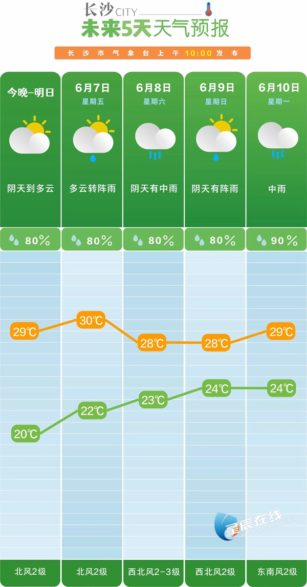 根据长沙气象部门数据显示,预计5日晚到6日,阴天到多云,气温20~29℃。7日白天到9日,多阵性降水;10到12日,有一次较强降水过程。