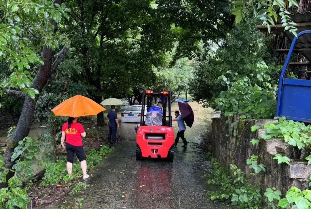 浏阳关口街道长兴社区石咀组因地势低洼,造成居民车辆被淹。眼见积水没过车轮,长兴社区立即调用叉车,将车辆从水中拖出,并转移至安全位置。