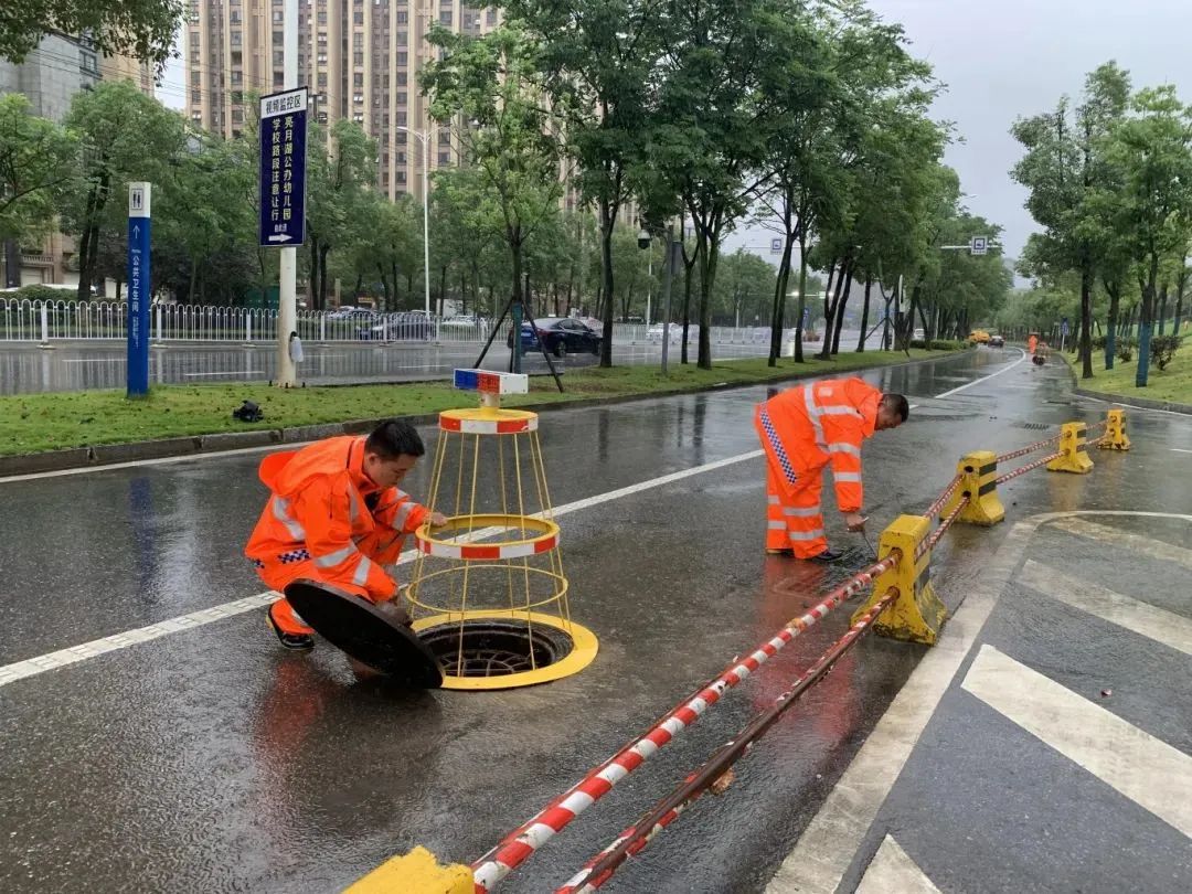 降雨之后,宁乡市住建局排水事务中心的工作人员紧急调集防汛抢险应急队,运用撬棍、铁锤等工具打开检查井进行强排积水作业,对道路上被树枝、树叶堵塞的雨水箅子进行清理,保障排水畅通。