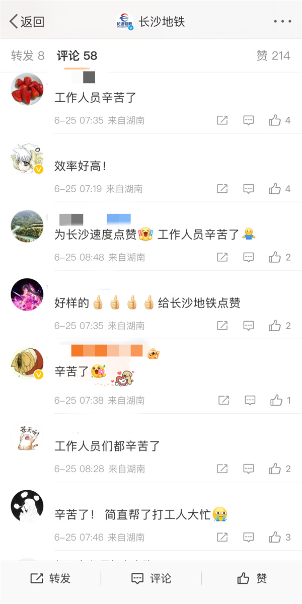 “点赞长沙速度!”“工作人员辛苦了!”“太棒了,可以不用多走一站上班了。”长沙地铁在官方平台发布信息后,许多网友在底下跟评,大家为地铁工作人员点赞,为长沙速度、长沙温度点赞。
