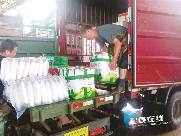 在长沙海吉星物流园,货车、转运车穿梭不停,二级市场的采购车也提前到达市场进行装车、发车,市场内部人头攒动,一片繁忙景象。