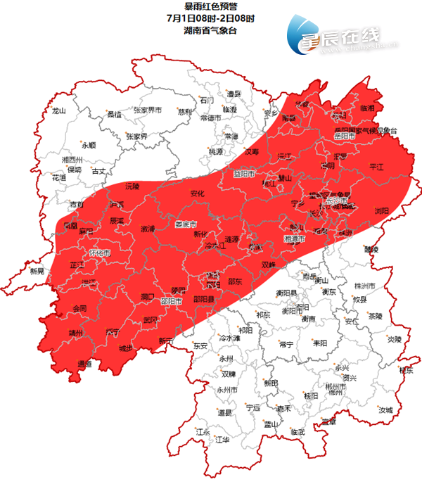 星辰在线7月1日讯(星辰全媒体记者 晨星)湖南省气象台07月01日06时发布暴雨红色预警:预计1日08时至2日08时,长沙、湘潭、邵阳、岳阳、益阳、怀化、娄底、湘西州东南部部分地区将出现暴雨,部分地区大暴雨,局地特大暴雨,并伴有短时强降水、雷雨大风等强对流天气,请加强防范。