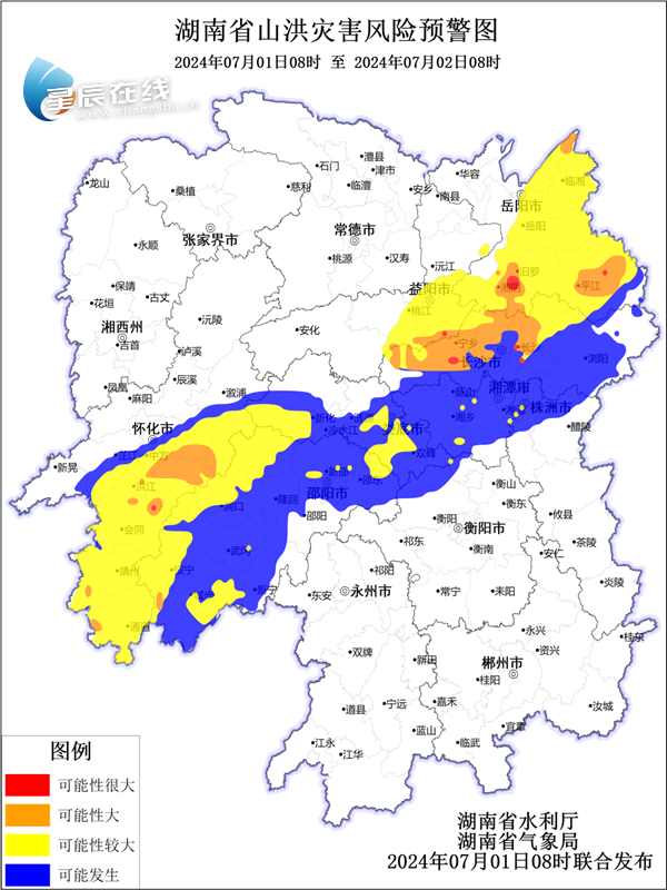 根据湖南省气象局7月1日预报,湖南省水利厅与湖南省气象局联合会商得出如下结论:受降雨影响,7月1日08:00至2日08:00,长沙市、益阳市、岳阳市、娄底市、怀化市、株洲市、湘潭市、衡阳市、邵阳市等9市有发生山洪灾害的风险,具体如下: