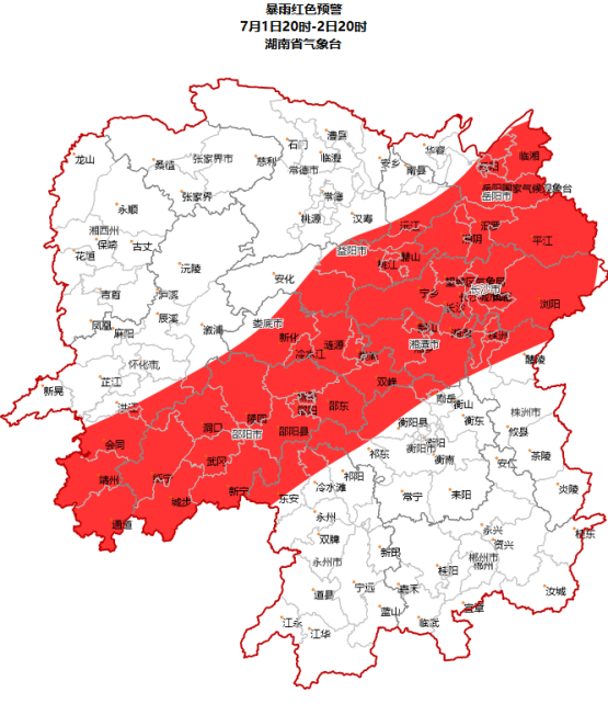 星辰在线7月1日讯(星辰全媒体记者 田也)7月1日16时,湖南省气象台发布暴雨红色预警:预计1日20时至2日20时,长沙西北部将出现暴雨,部分地区大暴雨,局地特大暴雨,并伴有短时强降水、雷雨大风等强对流天气。