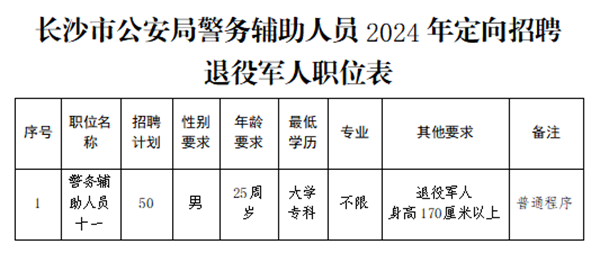 星辰在线7月4日讯(星辰全媒体记者 易博奇)近日,《长沙市公安局2024年招聘330名警务辅助人员公告》发布,计划13个岗位招聘330名,其中面向退役军人定向招聘50名。
