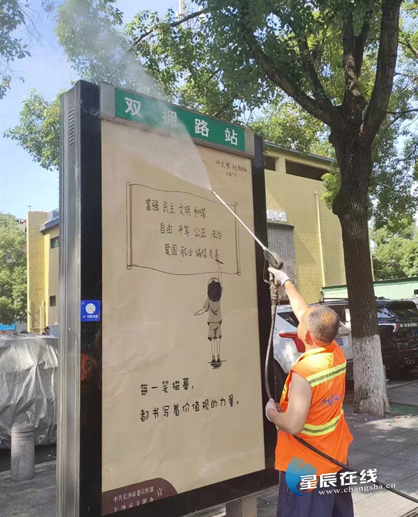 (四方坪环卫所人机配合清洗双拥路公交站台。)
