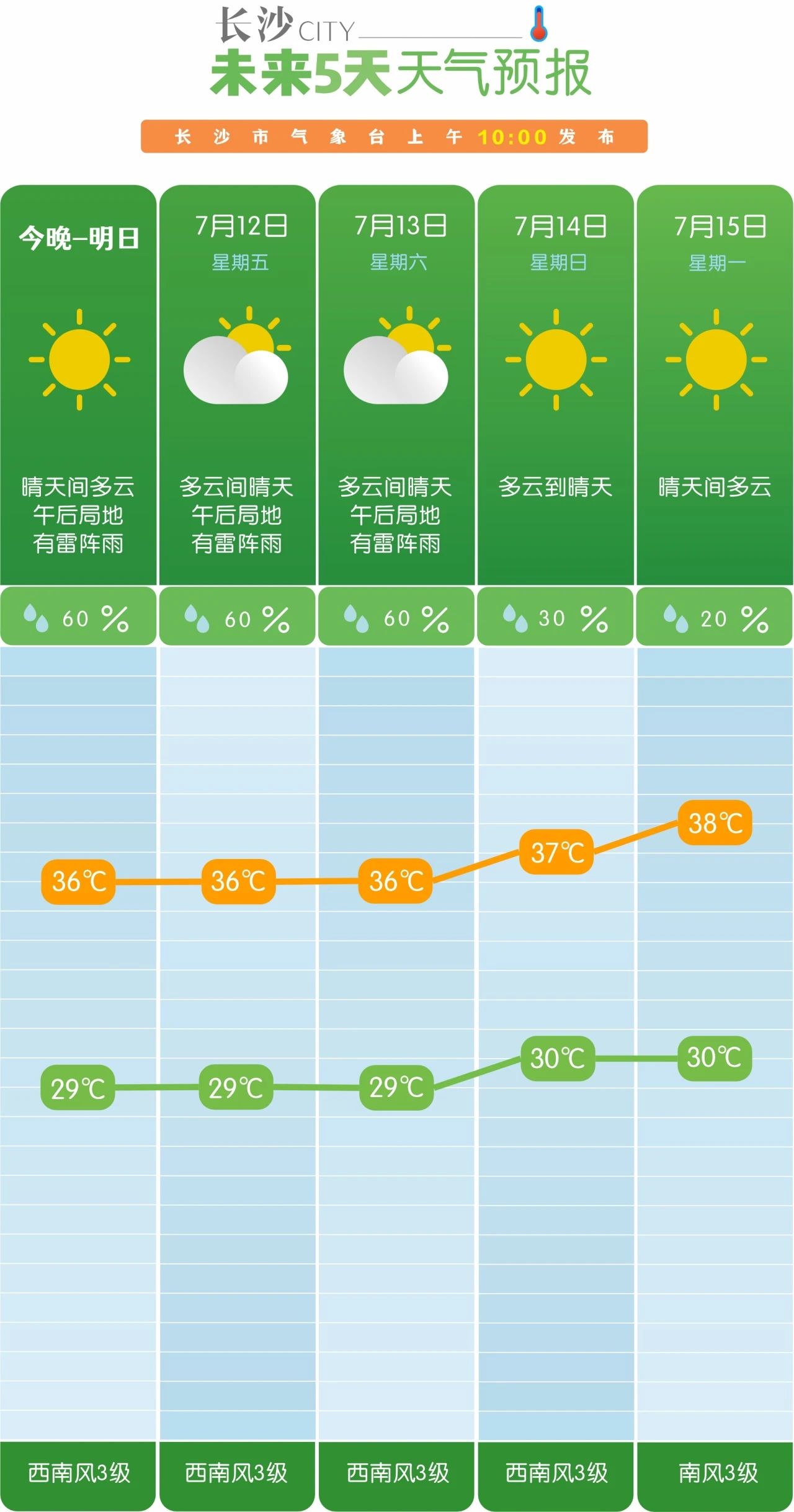 据长沙气象部门预计,今晚到明天,晴天间多云、午后局地有雷阵雨,气温29-36℃。11到13日,云系增多,午后局地有雷阵雨;14到17日,副高控制,晴天为主,最高气温达38℃左右。