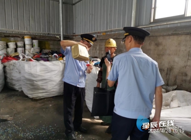 (长沙县行政执法局接长沙市生态环境保护综合行政执法支队线索后,组织执法人员对辖内某废旧物资回收经营部进行现场检查。)