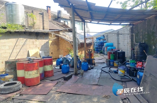 (高原社区村民私宅的废矿物油处置点未建设污染防治设施,现场地面油渍明显。图片均由长沙市生态环境保护综合行政执法支队提供)